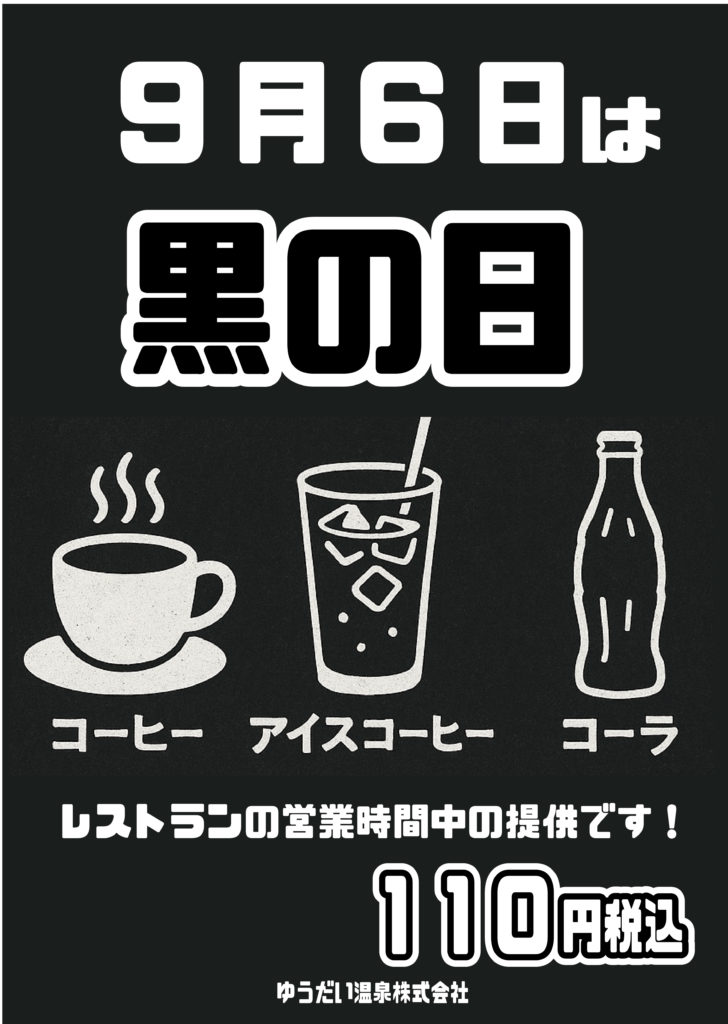 9月6日は黒の日(クロ)なんですって。これに因んで黒い飲み物を格安な価格でご提供いたします。