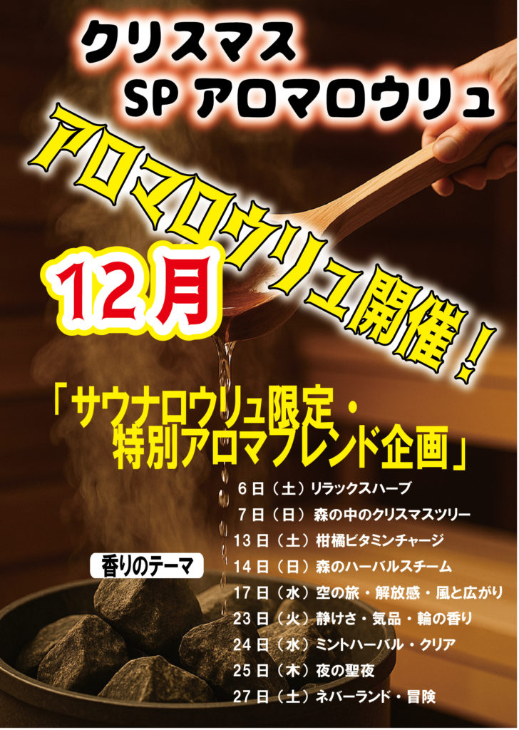 12月はアロマロウリュを特別ブレンドで実施。クリスマス向けの香りを日替わりで提供します。サウナー必見...